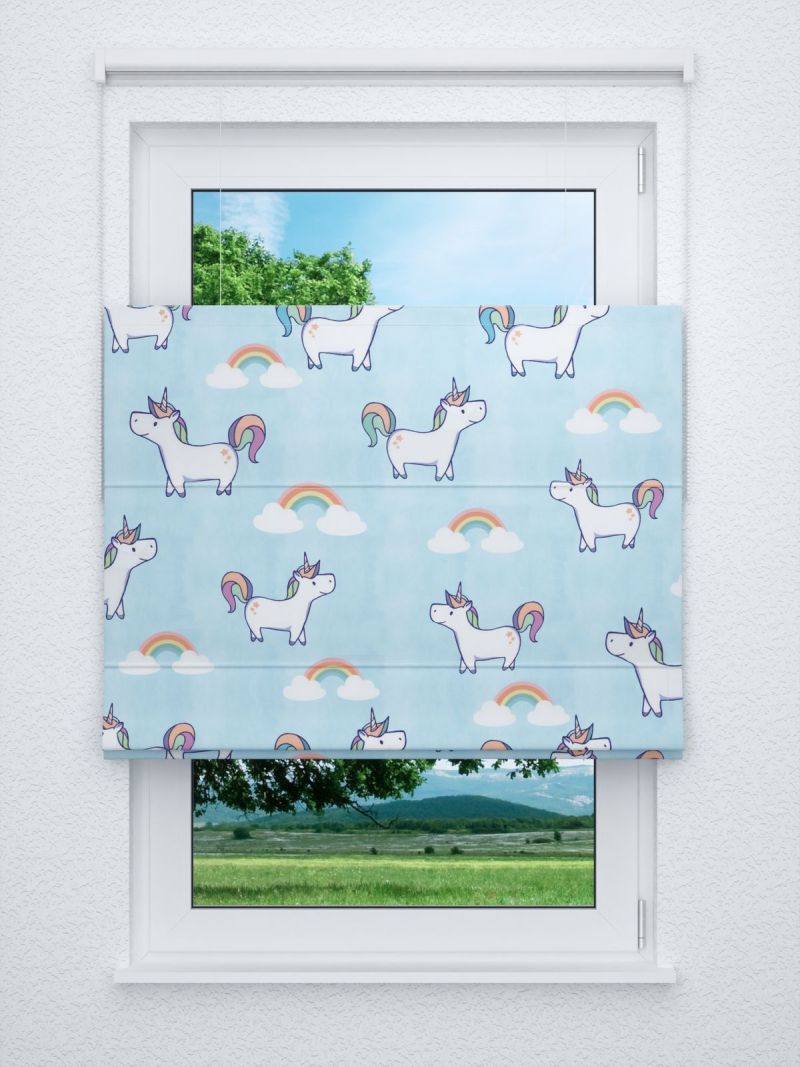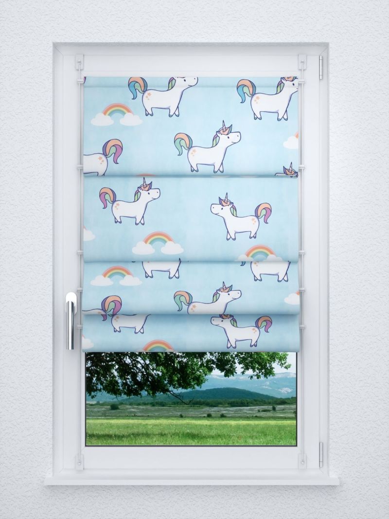 Mit dem fantasievollen Einhorn Design ist dieser Stoff die beste Basis für bunte Kinderzimmer Accessoires. Die Einhörner wirken aufgeweckt und blicken freundlich drein. In gleichmässigen Abständen sind sie versetzt auf dem Stoff drapiert und einander zugewandt. Mit der bunten Mähne und dem bunten Schweif ziehen sie die Aufmerksamkeit auf sich, die Sterne greifen einen Farbton auf und fügen sich so in das Gesamtbild ein. Ebenso sind die Regenbögen eine schöne Ergänzung für das liebevoll und kindlich wirkende Design. Da der Stoff auch in Meterware erhältlich ist, können Sie individuelle Accessoires selbst nähen. Im Konfigurator dagegen stellen Sie sich Fensterdeko & Co. nach Mass zusammen. Bei einem massgefertigten Gardinenschal, der die perfekte Mischung aus Helligkeit und Sichtschutz bietet, können Sie unter anderem die Aufhängung individuell festlegen. Das Polyestergewebe lässt mildes Licht hindurch, neugierige Blicke werden stets abgeschirmt.