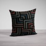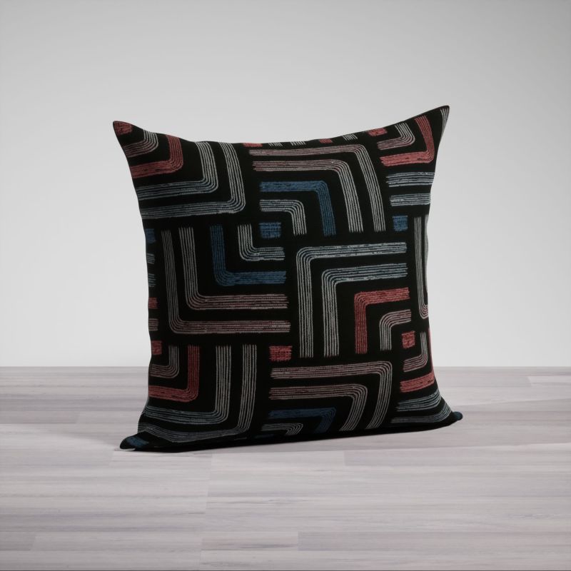 Ineinander gelegte Rechtecke aus feinen Webfäden in hellem Rot und gedämpftem Blau, das an Fernblau oder Taubenblau erinnert, sowie hellem Grau heben sich als Muster wirkungsvoll von dem schwarzen Stoff der Kissenhülle ab und verleihen dem Design einen einzigartigen Ausdruck mit individueller Note. Die warmen und kühlen Nuancen ergänzen sich perfekt und lassen eine wunderbare Harmonie entstehen. Bringen Sie auch in die Deko Ihres Wohnbereichs Abstufungen dieser Farben ein, wirkt das Interieur insgesamt stimmig und einladend.