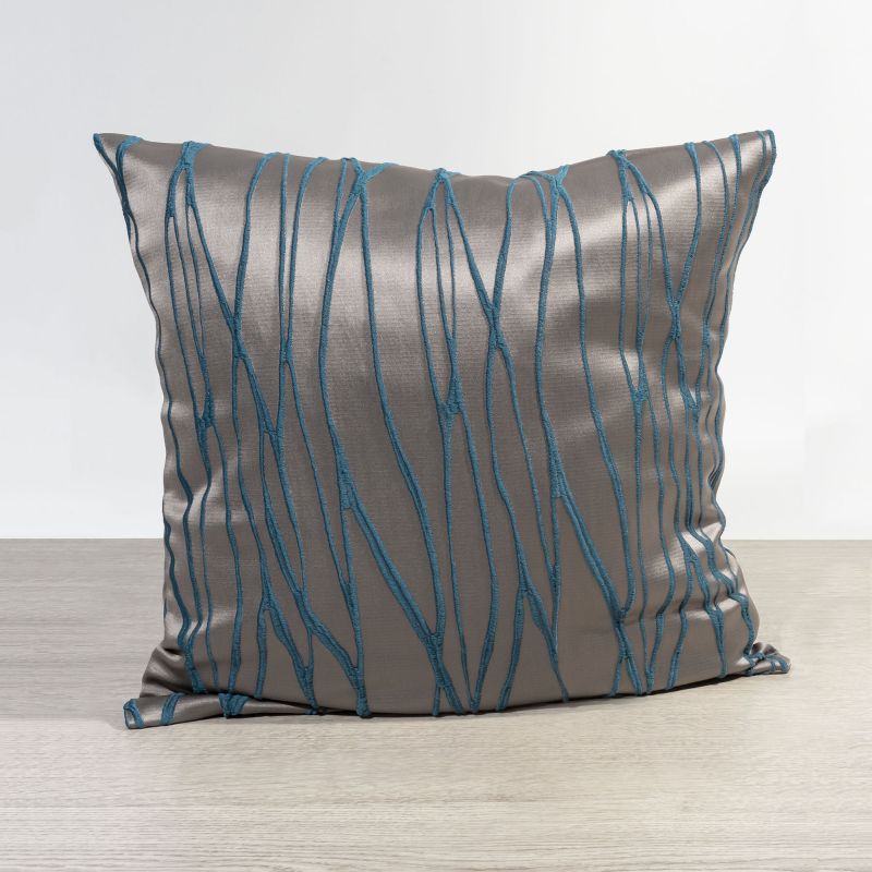 Auf dem dezent schimmernden, graubraunen Stoff stechen die Blätterformen ausdrucksstark hervor. Die petrolblauen Highlights sorgen für Frische, der erdige Braunton für Wärme, Ruhe und Harmonie. Auf diese Weise ergänzen sich die beiden gegensätzlichen Farben perfekt; die Kombination mit dunklen Brauntönen, mit unifarbenen Accessoires in Creme, Türkis und Petrol bietet sich ebenso an wie diejenige mit dunklem oder rötlichem Holz, mit Accessoires in Gold-, Kupfer oder Messing-Optik.