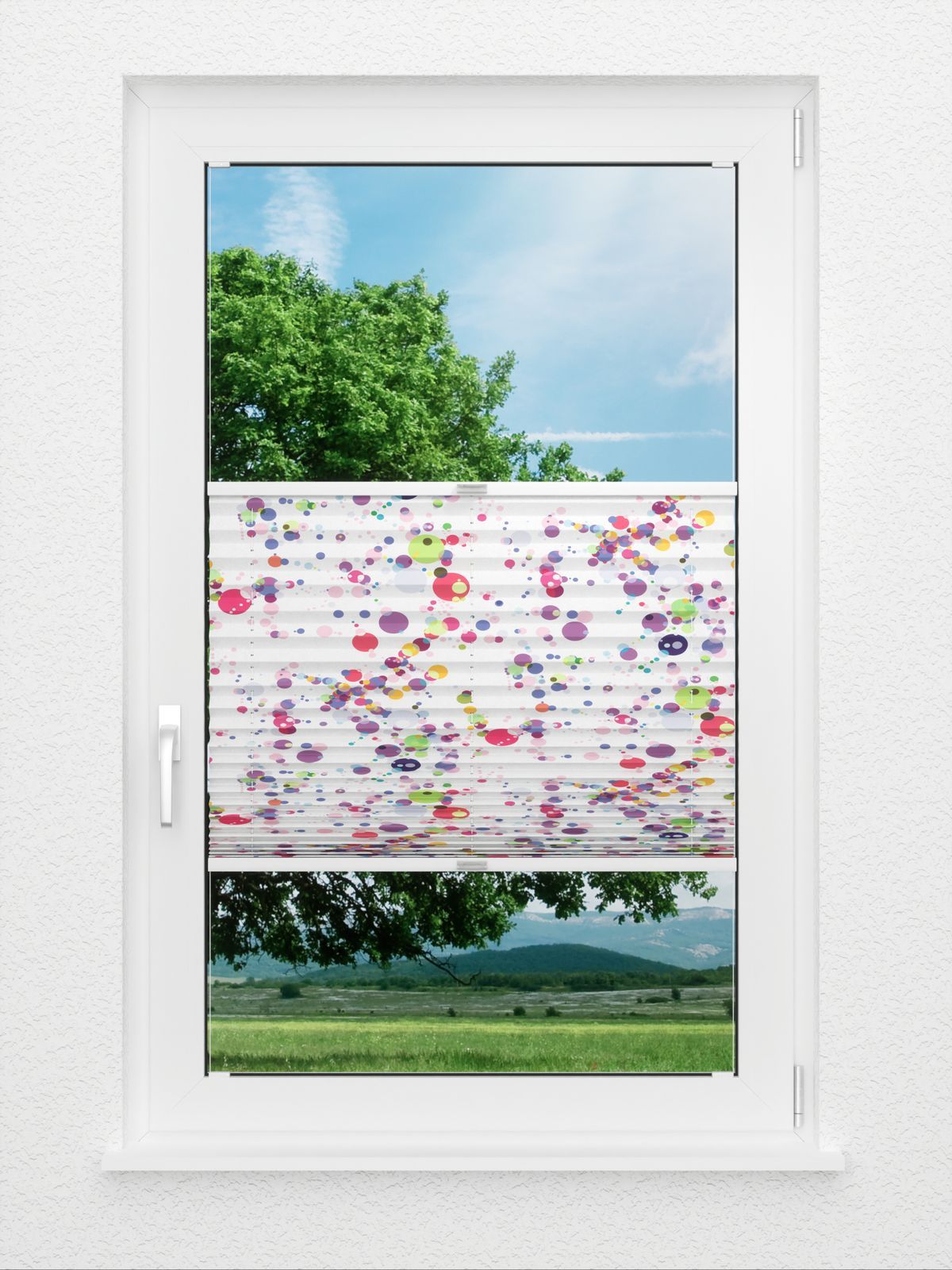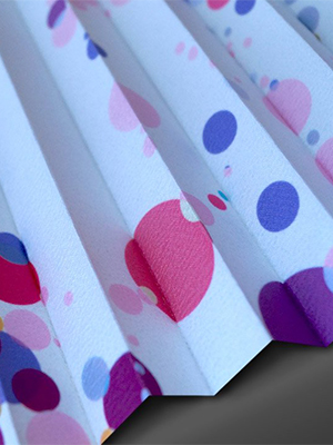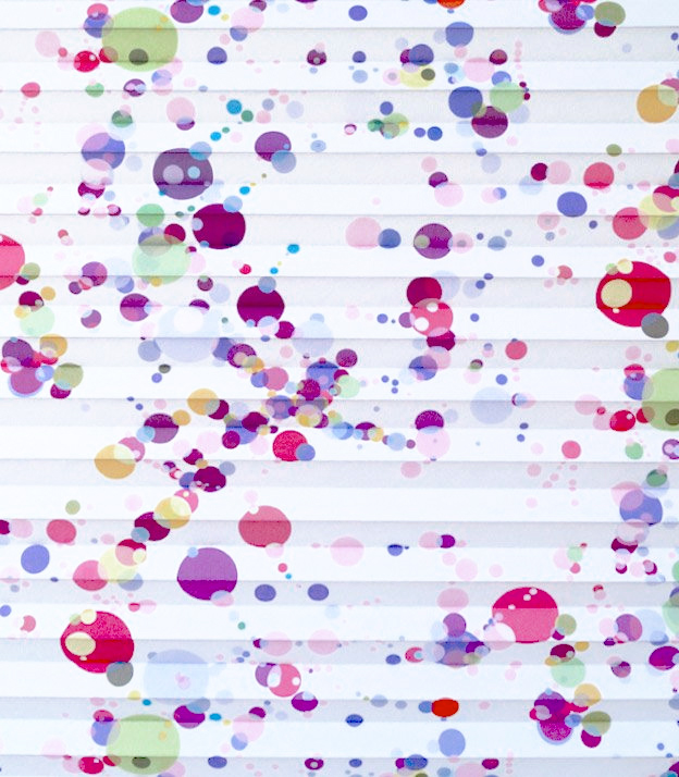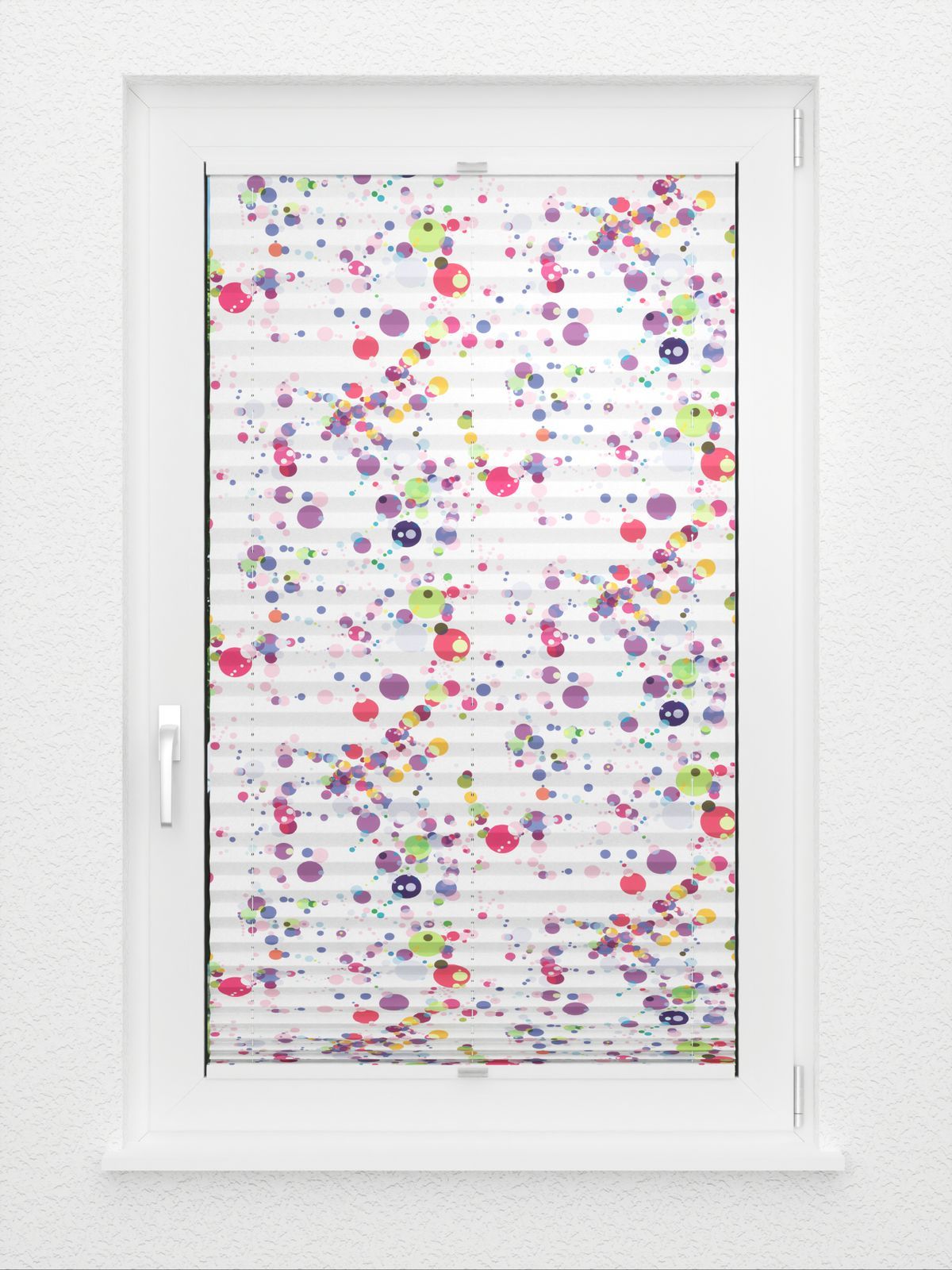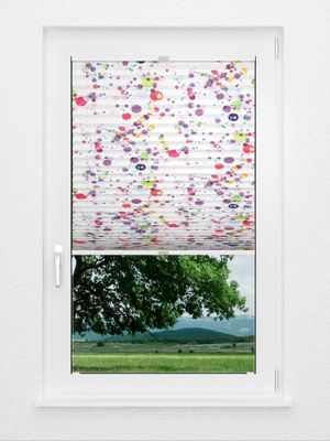 Verdunkelung, Wärmeschutz und Blendschutz am Bildschirmarbeitsplatz, all das bietet dieser Stoff dank seiner weissen Rückseitenbeschichtung. Sein munteres Design mit vielen bunten Punkten lässt dabei auch gleich auf ein mögliches Anwendungsgebiet schliessen: Das Kinderzimmer. Zur leichten Reinigung kann der Stoff feucht abgewischt werden. Grosse und kleine Punkte in allen möglichen Nuancen von Grün, Rot, Blau bis hin zu Violett und Gelb verteilen sich unregelmässig auf dem weissen Plisseestoff. Auf diese Weise verströmt der Stoff pure Lebensfreude und zaubert mit Leichtigkeit ein Lächeln ins Gesicht.