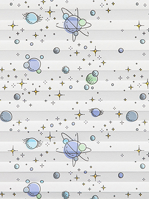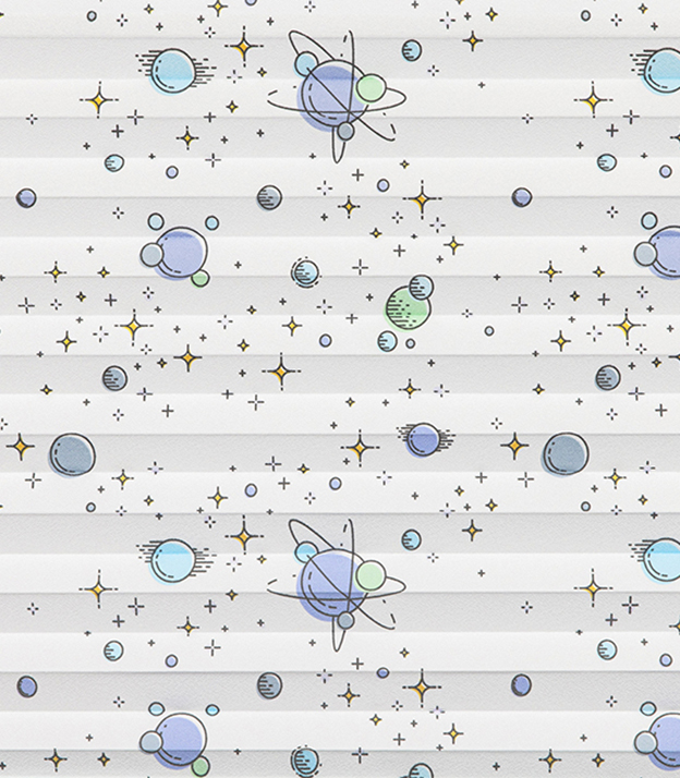Auf dem hellen Plissee kann das gesamte Sonnensystem spielerisch entdeckt werden. Die Planeten sind als unterschiedlich grosse Kugeln in den Farben Hellblau, Hellgrün, Dunkelblau und Violett dargestellt, während kleine Sterne in zartem Pastellgelb dazwischen angeordnet sind. Wenn Sie diese Farben oder deren Abstufungen in der restlichen Kinderzimmerdekoration einbinden, entsteht ein harmonisches, einladendes Ambiente, das einen sicheren und behüteten Rückzugsort bietet.