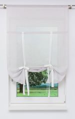 Dieses hübsche Bändchenrollo im Landhausstil wirkt durch die leinenartige Struktur wunderbar natürlich. Im oberen Drittel des Bändchenrollos ist ein Tunnel eingefügt, in welchen Sie die mitgelieferte Beschwerungsstange einschieben. Die zwei breiten Bändchen, die zum Raffen dienen, haben hier ihren Ursprung und können als grosse Schleifen links und rechts dekoriert werden. Damit können Sie die Höhe des Faltenwurfs individuell anpassen, auf diese Weise Lichteinfall und Atmosphäre verändern. Die Bändchen heben sich farblich dezent von dem Stoff ab. Der Tunnel am oberen Abschluss wiederum dient dazu diese Deko auf eine Klemm- oder Gardinenstange aufzuziehen. Diese finden Sie ebenso wie passendes Zubehör, etwa Adapter und Raffhaken, hier im Shop. Das transparente Polyestergewebe lässt viel Licht in den Raum, diesen optisch grösser, zudem offen, einladend und freundlich wirken. Am Fenster erfüllt dieser Behang vornehmlich dekorative Zwecke.