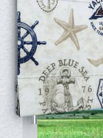 Der marmorierte, leinenähnliche Stoff mit griffiger Haptik und grober Struktur ist die perfekte Basis für das maritime Design. Auch wenn der Hintergrund an die tosende See erinnern kann, die grossen Symbole, etwa Möwen, Anker, Steuerräder, Schriftzüge, Flaggen und Schilder, heben sich durch die einheitliche Gestaltung sanft, aber wirkungsvoll von dem Hintergrund ab und sorgen für ein leichtes, unbeschwertes Flair im Raum. Dabei kann dieses Polyestergewebe die Grundlage für die verschiedensten Arten von Accessoires sein, etwa Kissenbezüge, Tischdecken oder Sicht- und Sonnenschutz am Fenster. Sie können diese selbst nähen oder unseren Konfigurator nutzen, der ebenfalls viel Gestaltungsfreiheit bietet. Als Gardinenschal oder Raffrollo nach Mass am Fenster befestigt lässt der Stoff mildes Licht hindurch, gleichzeitig bleibt Ihre Privatsphäre gewahrt. Selbst abends bei eingeschalteter Beleuchtung sind von aussen höchstens grobe Konturen wahrnehmbar.