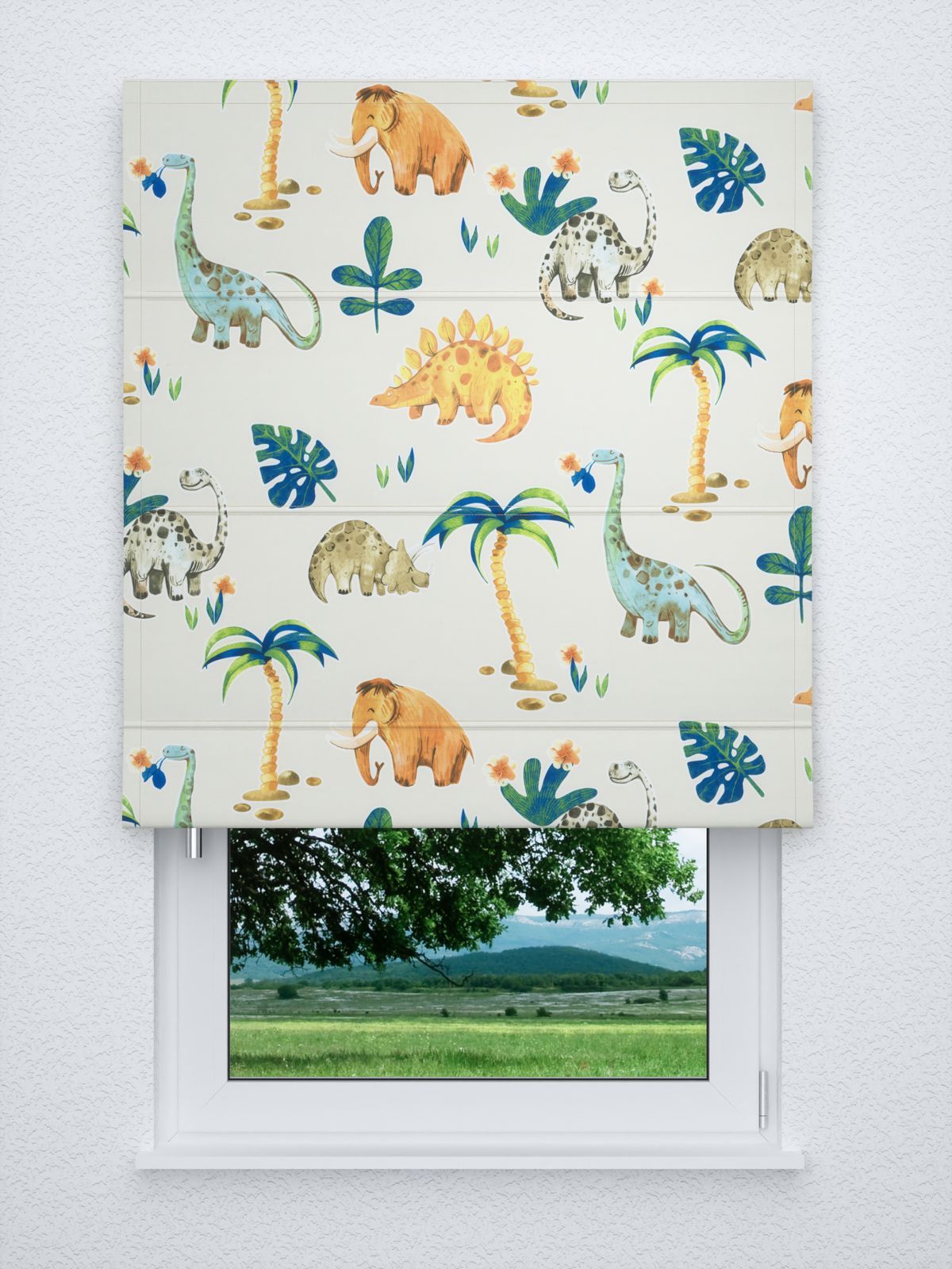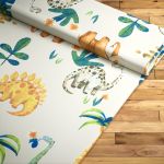 Auf dem cremefarbenen Stoff sind einige Dinos in leuchtenden, intensiven Farben gestaltet. Andere wiederum sind eher dezent gehalten. Der sanftmütige Langhals in Hellblau und Braun unterscheidet sich zum Beispiel klar von den in Gelb-Orange gestalteten, Fleisch fressenden Sauriern. Man mag meinen, dass sich die Gestaltung auch ein bisschen nach dem Charakter der Tiere richtet. Das frische Grün der Palmen und Pflanzen sorgt für ein angenehmes, entspanntes Flair.