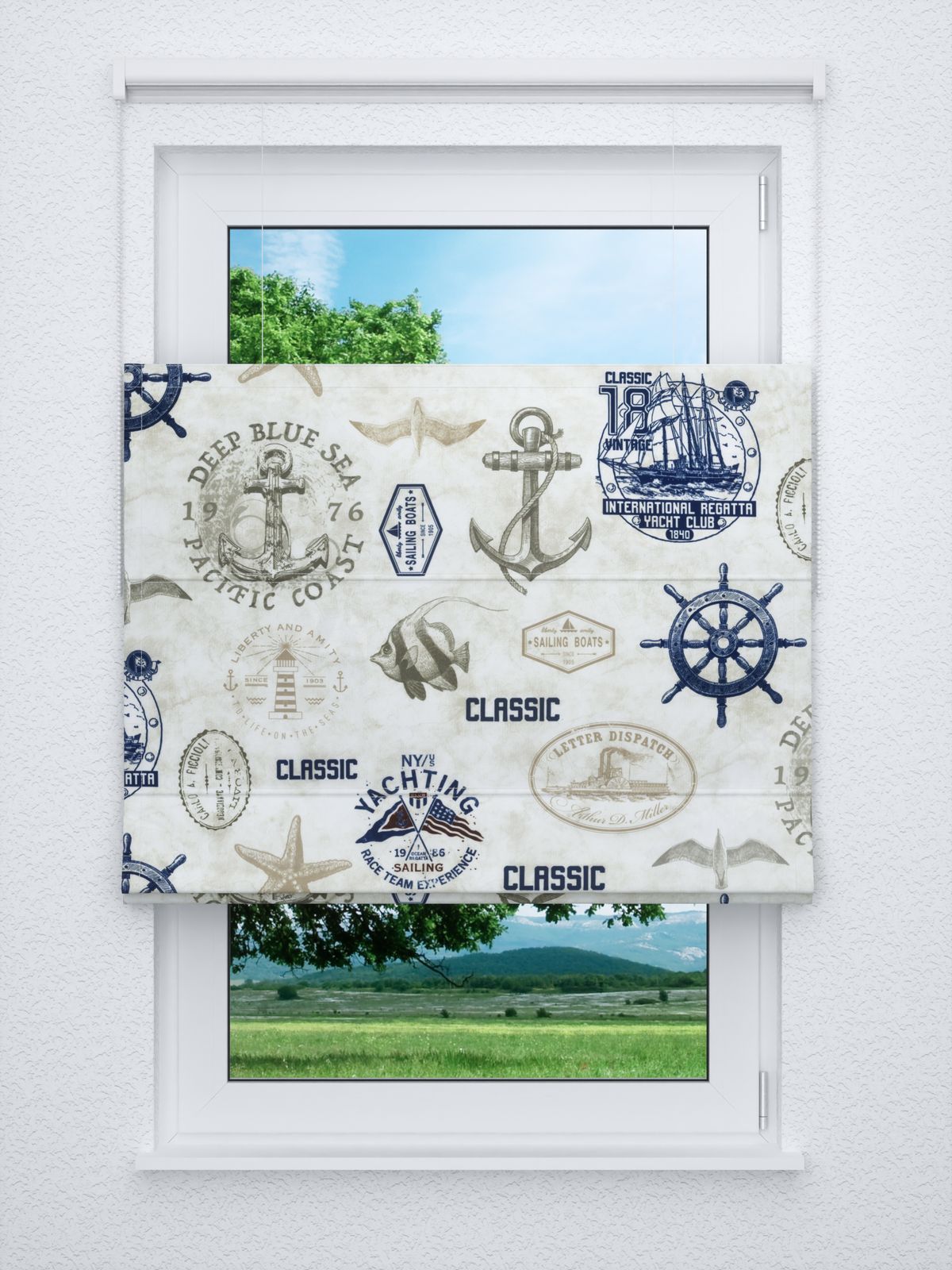 Der marmorierte, leinenähnliche Stoff mit griffiger Haptik und grober Struktur ist die perfekte Basis für das maritime Design. Auch wenn der Hintergrund an die tosende See erinnern kann, die grossen Symbole, etwa Möwen, Anker, Steuerräder, Schriftzüge, Flaggen und Schilder, heben sich durch die einheitliche Gestaltung sanft, aber wirkungsvoll von dem Hintergrund ab und sorgen für ein leichtes, unbeschwertes Flair im Raum. Dabei kann dieses Polyestergewebe die Grundlage für die verschiedensten Arten von Accessoires sein, etwa Kissenbezüge, Tischdecken oder Sicht- und Sonnenschutz am Fenster. Sie können diese selbst nähen oder unseren Konfigurator nutzen, der ebenfalls viel Gestaltungsfreiheit bietet. Als Gardinenschal oder Raffrollo nach Mass am Fenster befestigt lässt der Stoff mildes Licht hindurch, gleichzeitig bleibt Ihre Privatsphäre gewahrt. Selbst abends bei eingeschalteter Beleuchtung sind von aussen höchstens grobe Konturen wahrnehmbar.