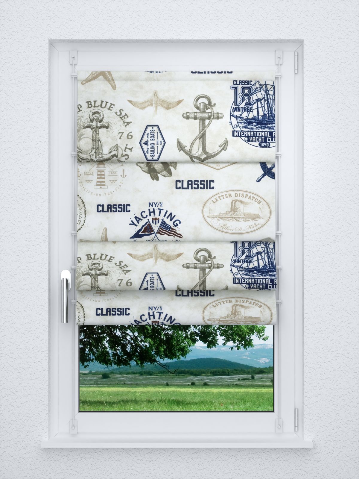 Der marmorierte, leinenähnliche Stoff mit griffiger Haptik und grober Struktur ist die perfekte Basis für das maritime Design. Auch wenn der Hintergrund an die tosende See erinnern kann, die grossen Symbole, etwa Möwen, Anker, Steuerräder, Schriftzüge, Flaggen und Schilder, heben sich durch die einheitliche Gestaltung sanft, aber wirkungsvoll von dem Hintergrund ab und sorgen für ein leichtes, unbeschwertes Flair im Raum. Dabei kann dieses Polyestergewebe die Grundlage für die verschiedensten Arten von Accessoires sein, etwa Kissenbezüge, Tischdecken oder Sicht- und Sonnenschutz am Fenster. Sie können diese selbst nähen oder unseren Konfigurator nutzen, der ebenfalls viel Gestaltungsfreiheit bietet. Als Gardinenschal oder Raffrollo nach Mass am Fenster befestigt lässt der Stoff mildes Licht hindurch, gleichzeitig bleibt Ihre Privatsphäre gewahrt. Selbst abends bei eingeschalteter Beleuchtung sind von aussen höchstens grobe Konturen wahrnehmbar.