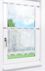 Mit der transparenten Scheibengardine in einer leichten Netzstruktur holen Sie sich den Frühling nach Hause, Die grossen weissen Blumestickereien, die die Gardine zieren, bewegen sich mit schwungvollen Ornamenten von rechts nach links und erzeugen dadurch eine besondere Dynamik. Auch der Stabdurchzug ist mit Blumen verziert. Am Ende wird die Gardine von einer feinen Linie umrandet, die Abschlüsse der Stoffbahnen bilden moderne blätterähnliche Symbole, die die Netzstruktur nochmal zum Vorschein bringen. Die Gardine fügt sich durch ihr unaufgeregtes und stilvolles Design perfekt in moderne Wohnräume ein und bildet eine geschmackvolle Ergänzung.