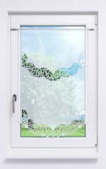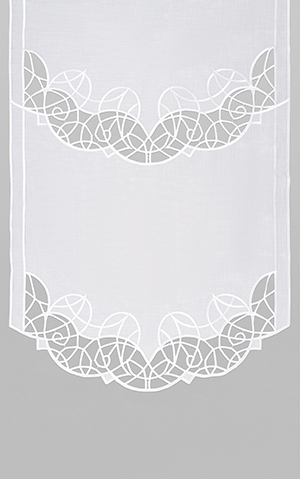 Mit einem geschwungenen bogenförmigen Abschluss, der sich als abstraktes, edel schimmerndes Muster erweist, aus verschiedenen Bögen und Kringeln besteht, sticht dieser Scheibenhänger aus Plauener Spitze® von allen anderen Gardinen hervor. Das angefügte Muster kommt hier zweimal vor, hebt sich je nach Farbgestaltung nur durch die Aussparungen und das Zusammenspiel der Linien ab. Besonders imposant wirkt es, wenn das Muster durch eine andere Farbe hervorsticht und dem gesamten Design einen aussergewöhnlichen Look verleiht. Da dieser Scheibenhänger als Rapportware erhältlich ist, lassen sich mit diesem Behang vielfältige Gardinenvariationen realisieren und Stoffe verschiedener Länge, etwa die Verbindung von Schiebegardinen und Scheibengardinen, zu einer individuellen Deko zusammenstellen.