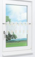 Diese klassisch und floral gestaltete Scheibengardine von Plauener Spitze® fällt wegen der geschmückten Abschlüsse, die wie eine Muschel wirken, vor allem aber aufgrund der Vielfalt an Designs auf. Die kleinen Blümchen werden durch schwungvolle Ornamente, zarte Blattranken und mit dem Umriss eines Kleeblatts gezeichneten Netzmuster ergänzt. Dieses taucht in Ringen, die an die Blüten angrenzen, sowie im oberen und unteren Abschluss erneut auf. Der weisse Stoff bringt die bunten Blümchen besonders gut zur Geltung. Durch die sich stets wiederholenden Designelemente wirkt diese Fensterdeko wunderbar harmonisch. Das transparente Gewebe lässt mildes Licht hindurch und trägt zu einer offenen und einladenden Atmosphäre bei. Tagsüber haben Sie einen gewissen Sichtschutz. Die Scheibengardine wird mit Stangendurchzug befestigt und ist in verschiedenen Höhen und Breiten erhältlich. Spannvitragen, Klemm- und Pinnstangen zum Aufhängen finden Sie ebenso wie Klebehaken und Klemmträger hier im Shop.
