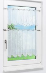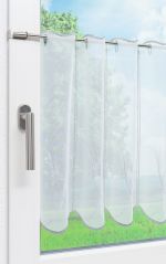 Durch die glänzende, geschwungene Umrandung ist diese ansonsten in Weiss gestaltete Scheibengardine eine elegante und stilvolle Dekoration, die weniger verspielt, vielmehr natürlich wirkt. Am wellenförmigen unteren Abschluss sind zwei sich kreuzende Federn aufgebracht, die dieselbe Farbe haben, wie die Umrandung. Ferner können sie auch an Ähren erinnern. Die transparente Scheibengardine mit praktischem Stangendurchzug wird einfach ins Fenster gehängt. Sie lässt viel Licht in den Raum, gestaltet diesen offen, einladend und freundlich. Dieses Modell ist in verschiedenen Höhen und Breiten erhältlich; Spannvitragen, Klemm- und Pinnstangen zum Aufhängen finden Sie ebenso wie Klebehaken und Klemmträger hier im Shop. Bei Bedarf können Sie das Polyestergewebe schonend bei 30 Grad in der Maschine reinigen.