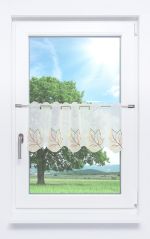 Diese farbenfrohe Scheibengardine zieht den Betrachter mit vielen Details und bunten Herbstblättern in den Bann. So reihen sich Ahornblätter in abwechselndem Design aneinander, das an ein prachtvolles, buntes Mosaik erinnert. Es hängen Fäden herab, an welchen Fliegenpilz und Kürbis befestigt sind. Ein kleines Rotkehlchen sitzt am unteren Abschluss eines jeden Rapports. Der Stangendurchzug ist hübsch mit Dreiecken, grobem Maschengeflecht und weiteren bunten Herbstblättern verziert. Diese transparente Scheibengardine dient als reine Zierde und hat keinen Einfluss auf den Lichteinfall. Durch die warmen Farben und die liebevolle Gestaltung trägt dieses Modell jedoch wesentlich zur Gemütlichkeit und Behaglichkeit im Raum bei.