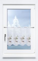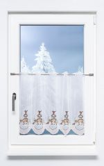 Diese Scheibengardine im weihnachtlichen Stil zieht Sie mit den liebevollen und detailgetreuen Stickereien von Rehen im Winterwald in ihren Bann. Vor dem Hintergrund eines verschneiten Weihnachtsbaums beugt sich das grazile, anmutige Reh zu einer Futterkrippe hinunter. In der Mitte wird die Bistrogardine wie durch eine geschwungene Form geteilt, die an ein von Schnee bedecktes Dach erinnert. Währenddessen bewegen sich zarte Sternenschweife vom Himmel herab. Der obere Abschluss mit Stangendurchzug ist mit einer schwungvollen Bogenform und zwei verschneiten Tannenbäumen verziert; der untere Abschluss ist ebenfalls geschwungen, wirkt wie eine von Schnee bedeckte Landschaft. Das transparente, weisse Polyestergewebe mit den kunstvollen Stickereien lässt viel Licht hindurch, bietet tagsüber einen gewissen Sichtschutz. Für die Aufhängung können Sie hier Pinnstangen, Spannvitragen, Klemmträger und Klebehaken verwenden.