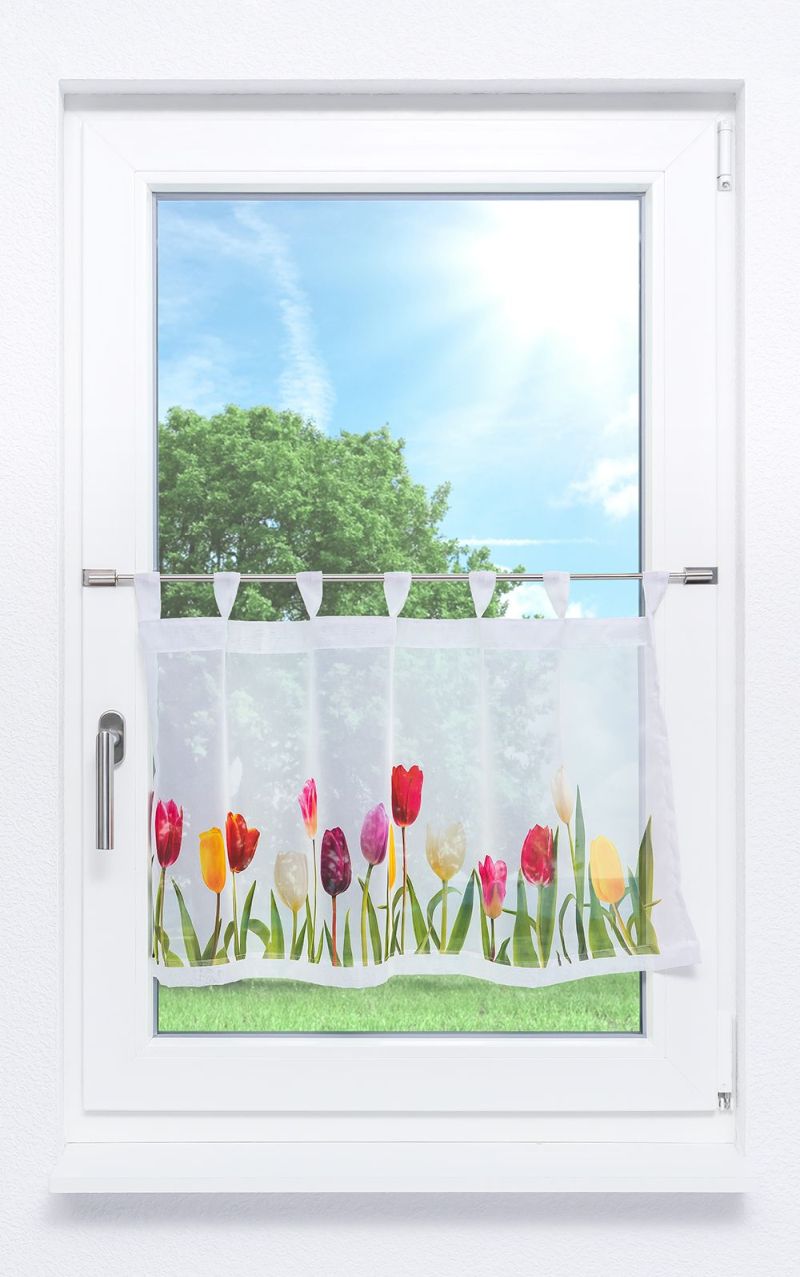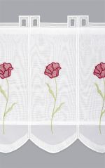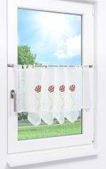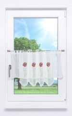 Von dem weissen, durchsichtigen Stoff der Scheibengardine hebt sich die in dunklem Weinrot gestaltete Blüte effektvoll ab. Und auch die Blätter in zartem Lindgrün unterstreichen das von der Natur inspirierte Design. Diese hübsche Scheibengardine passt besonders gut zu naturbelassenem hellen und rötlichen Holz sowie leichten Beigetönen, die für noch mehr Wohnlichkeit und Gemütlichkeit sorgen.