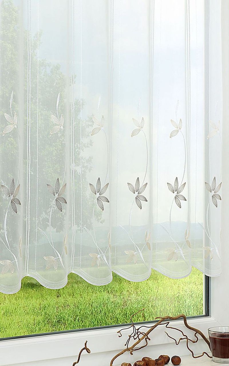 Diese zarte Scheibengardine fügt sich mit einem ebenso feinen Motiv in viele Wohnumgebungen spielend leicht ein und bereichert diese mit einer freundlichen, luftigen Aura. Das Design besteht aus geschwungenen, gestickten Linien, die vereinzelt mit formschönen Herbstblättern verziert sind. Die Äste verlaufen jeweils vom gewellten unteren Abschluss bis zur Mitte hin. Nicht zuletzt auch aufgrund der zurückhaltenden Farbgebung kann diese Bistrogardine die Deko jeder Jahreszeit schmuckvoll ergänzen und dezent im Hintergrund wirken. Die Scheibengardine ist in verschiedenen Höhen und Breiten erhältlich und wird mit dem Stangendurchzug einfach am Fenster befestigt. Der hauchzarte, weisse Polyesterstoff ist transparent und lässt daher viel Licht hindurch, gestaltet die Atmosphäre geschmackvoll und einladend.