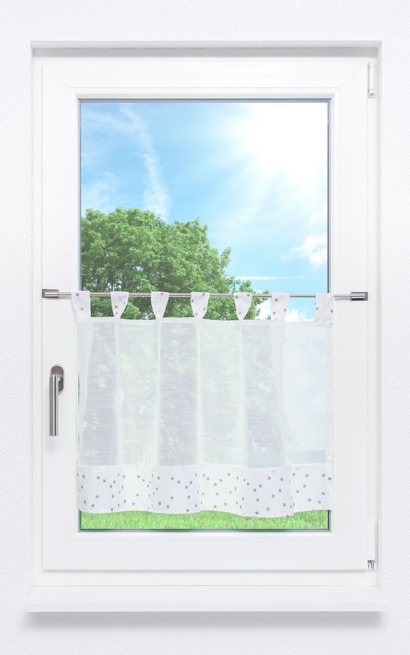 Diese Scheibengardine mit strukturierter Optik und Schlaufenaufhängung ist an den Schlaufen und am unteren Abschluss mit feinen Sternen gleicher Farbe und Grösse verziert. Aufgrund des Designs mit kleinen Sternchen kann diese transparente Scheibengardine auch am Fenster im Kinderzimmer dekoriert werden, dort beispielsweise mit blickdichten Vorhängen kombiniert abwechselnd für Verdunklung und Sichtschutz oder, bei an den Seiten drapierten Vorhängen, für ein helles und lichtdurchflutetes Ambiente sorgen. Durch die dezente Gestaltung kann dieses Modell abwechslungsreich mit Farben kombiniert werden. Mit Schlaufen ausgestattet lässt sich die Scheibengardine im Nu auf eine Klemmstange aufziehen und ohne Bohren ins Fenster hängen.
