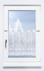 Die unifarbene Gestaltung setzt das Wintermotiv auf eine elegante und stilvolle Weise in Szene. Die Schönheit der kalten Jahreszeit lassen Sie mit dieser weissen Scheibengardine an Ihrem Fenster wirken. Mit warmem Holz, dunklem Tannengrün und weiteren Naturmaterialien können Sie die Deko schön ergänzen.