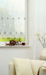 Diese transparente Scheibengardine kann mit ihrem dezenten Design viele Wohnumgebungen bereichern und diesen einen gemütlichen Charakter verleihen. In vertikaler Ausrichtung sind auf dem Rapport in gleichen Abständen Wollknäuel-ähnliche Gebilde in drei Farben aufgereiht. Gruppiert sind die Wollknäuel in dem Farbtrio am unteren, wellenförmigen Abschluss in unterschiedlichen Grössen erneut zu finden. Die Scheibengardine ist in verschiedenen Höhen und Breiten erhältlich und kann mit dem Stangendurchzug einfach am Fenster befestigt werden. Der hauchzarte, weisse Polyesterstoff ist transparent und lässt daher viel Licht hindurch, gestaltet die Atmosphäre geschmackvoll und einladend. Reinigen können Sie ihn bei 30 Grad im Schonwaschgang.