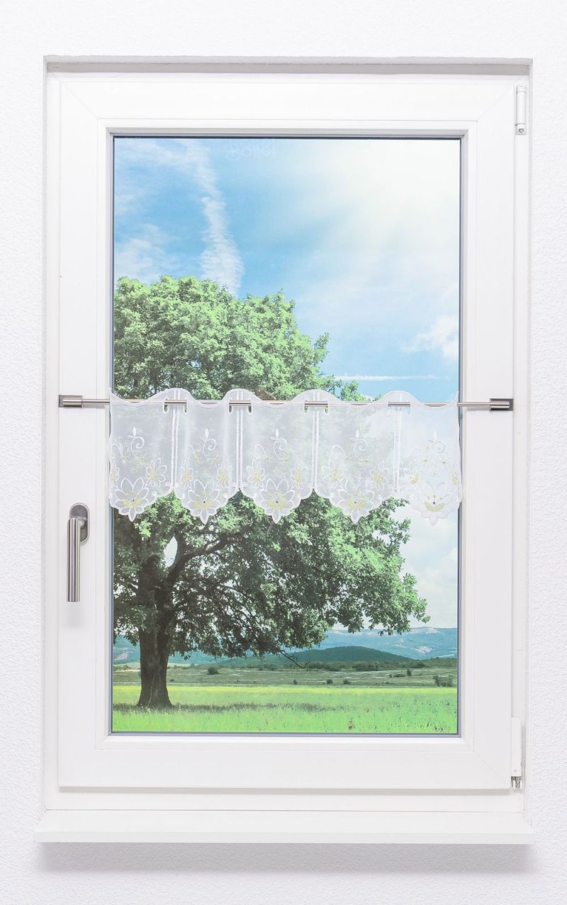 Die Bistrogardine ist fertig konfektioniert, mit vorgearbeiteten Durchbrüchen für den Stangendurchzug und kann somit gleich am Fenster angebracht werden. Der Stoff ist in verschiedenen Breiten erhältlich.