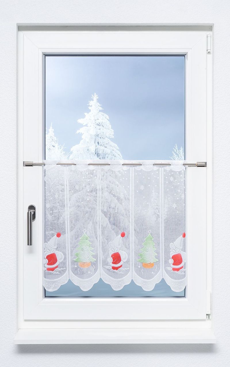 Diese hübsche weihnachtliche Scheibengardine ist abwechselnd mit Nikolaus und Tannenbaum geschmückt, die sich durch die ausdrucksstarken Farben von dem feinen, transparenten Stoff abheben. Im oberen Bereich des Behangs wird Schnee in zwei verschiedenen Formen dargestellt, als Punkte und als Kristalle. Der herabrieselnde Schnee sorgt für eine stimmungsvolle Atmosphäre, die bunten Motive für ein fröhliches und heiteres Ambiente. Da in den oberen Abschluss ein gewellter Bereich mit ellipsenförmigen Aussparungen eingefügt ist, können Sie dieses transparente Modell einfach auf eine Gardinenstange aufziehen. Den Motiven wird ein schöner Rahmen und durch den gewellten Abschluss ein verspielter Charakter verliehen. Mit dieser durchsichtigen Fensterdeko ändert sich der Lichteinfall kaum, der Raum wirkt weiterhin hell und freundlich.
