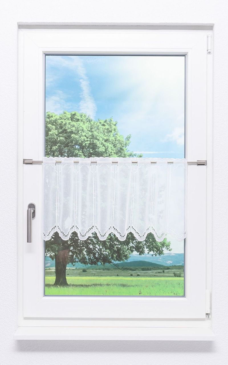 Diese filigran gearbeitete, transparente Scheibengardine fällt vor allem durch die gleichmässig aneinander gereihten Cut-Outs am unteren, wellenförmig gestalteten Abschluss auf. Die kleinen, kreisförmigen Löcher, die ein Stück weit vom Rand entfernt entlanglaufen, sorgen für ein spannungsvolles und abwechslungsreiches Design. Auch der obere Abschluss, also dort, wo sich der Stangendurchzug zur Aufhängung befindet, zeigt eine schöne Wellenform. Dabei lässt die durchscheinende Fensterdeko viel Licht in den Raum, der somit offener, weiter und heller wirkt. Die Verwendung der Bistrogardine lässt sich schon aus dem Namen ableiten. So eignet sie sich für das Verzieren kleiner Fenster, wie sie oft in der Küche vorkommen, besonders gut.