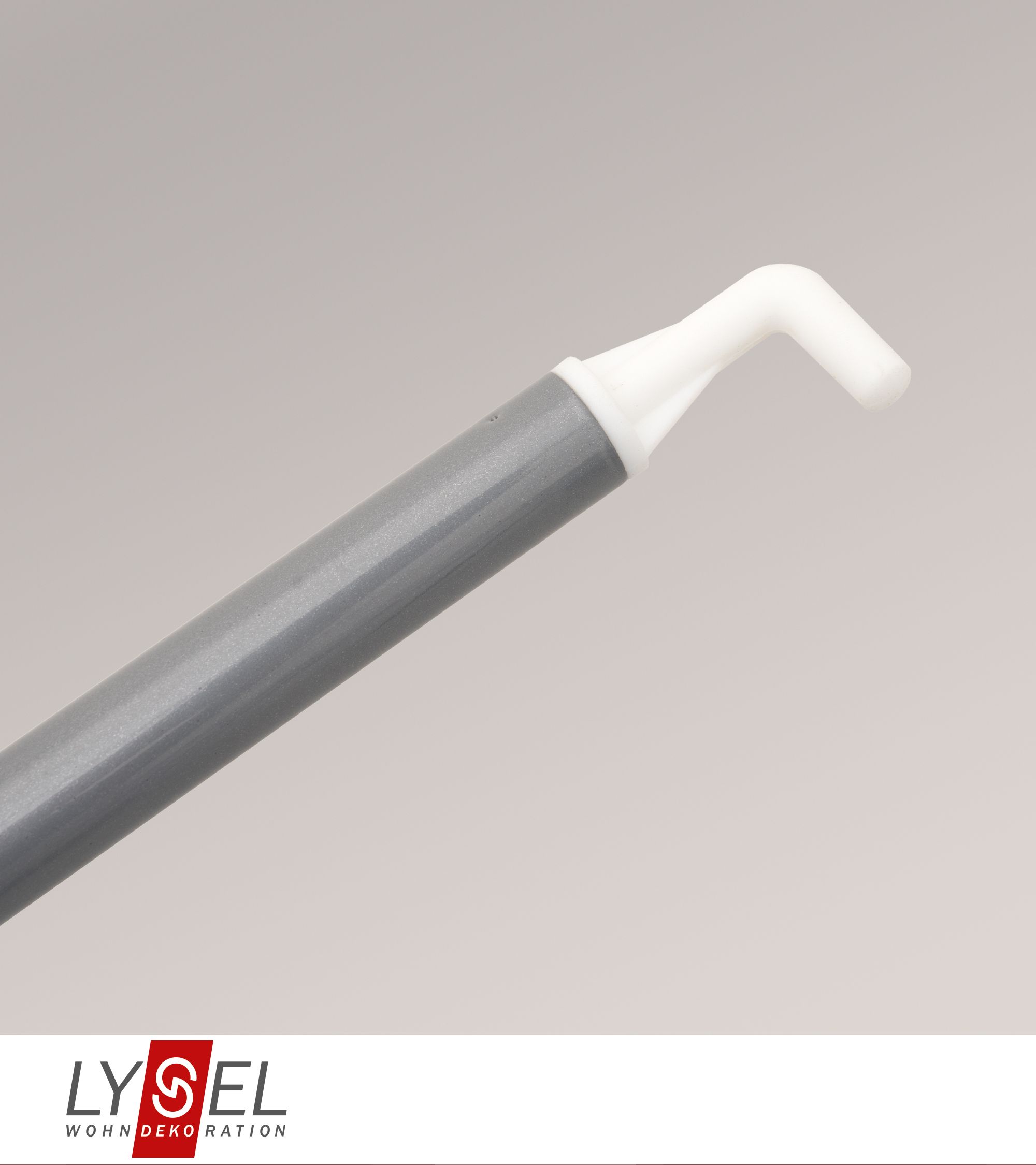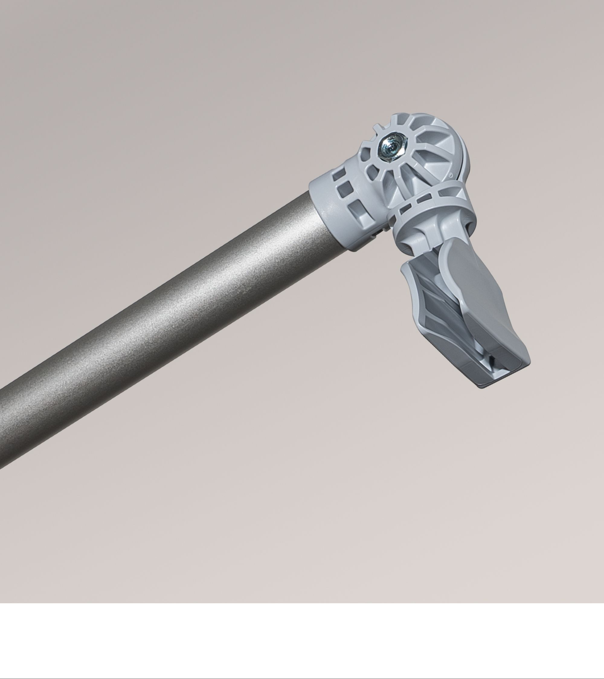 Dieser Bedienstab ist ausschliesslich für den "Bediengriff Decomatic #1W" geeignet. Er ist das perfekte Zubehör für Anlagen, die in grosser Höhe befestigt oder anderweitig schwer zugänglich sind. Plissees in Dachfenstern lassen sich damit präzise und bequem bedienen. Ein Stab genügt für mehrere Anlagen im Raum. Gefertigt ist er aus mattem Aluminium und schwarzem Kunststoff. Am oberen Ende befindet sich eine offene Klammer, die sich leicht auf einen Bediengriff aufsetzen lässt. Für den richtigen Winkel sorgt ein arretierbares Gelenk im vorderen Teil des Bedienstabes.