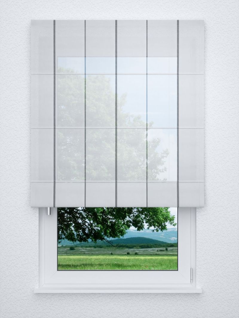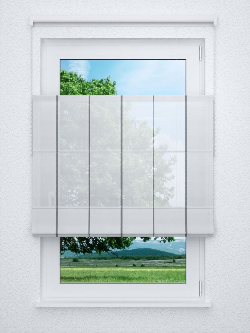 In seiner Struktur an feines Leinengewebe erinnernd trägt dieser transparente Polyesterstoff zu einem angenehmen und luftigen Ambiente bei. Er ist abwechselnd mit Streifen in unterschiedlichen Designs verziert. Eines davon zeigt ein Rautenmuster, das andere besteht aus drei feinen Linien. Da die beiden Streifen in derselben Farbe gestaltet sind, wirkt das Gesamtbild ausgesprochen harmonisch. Durch die reduzierte, kontrastreiche Optik kann sich dieses Modell in moderne Wohnumgebungen gut einfügen. Als massgefertigte Fensterdeko macht dieser am Rand mit Bleiband versehene Stoff eine besonders gute Figur. Dieses sorgt für einen schönen Fall und eine gleichmässige Optik. Für die Aufhängung und den unteren Abschluss stehen im Konfigurator mehrere Möglichkeiten zur Auswahl. Damit können Sie Ihr individuelles Accessoire gestalten. Als Meterware bietet der Stoff die grösste gestalterische Freiheit.