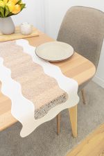 Diese Tischdeko ist in einem milden Weisston gestaltet, der hier als Ecru bezeichnet wird und den fliessenden sowie luftigen Charakter der wellenförmigen Deko erneut betont. Hinzukommt, dass einige der Fäden einen edlen Bronzeton erkennen lassen. Auf einen Tisch mit schöner Holzmaserung oder einer Tischdeko mit natürlichen Elementen passt dieses Modell besonders gut. Verwandte Beige- und Brauntöne sowie sattes Rot setzen es stimmig in Szene.