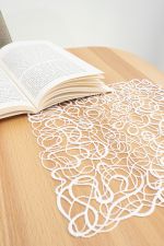 Als Deckchen, Tischläufer oder Tischdecke können Sie dieses Modell verwenden und in Szene setzen. Aus hochwertiger Plauener Spitze® gearbeitet lässt die Tischdeko ein Fadengewirr aus dünneren und dickeren Fäden erkennen, die eine Form entstehen lassen und das Gerüst der Tischdecke bilden. Eine schöne Lebendigkeit und Dynamik, aber auch eine gewisse Leichtigkeit kommen mit diesem Modell in den Raum, das zu Inspiration und Kreativität dient. Besonders effektvoll wirkt die Deko, wenn Sie auf eine cleane Oberfläche gelegt oder eine weitere unifarbene Tischwäsche gelegt wird.