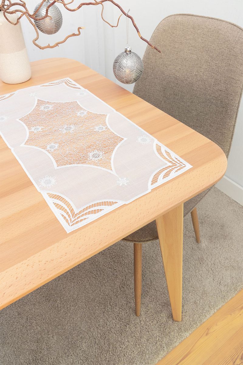 Mit einer geschwungenen Sternenform ist dieses Modell gestaltet, welches als Tischdecke, Tischläufer oder Deckchen gefertigt werden kann. Die Highlights in Form von Schneeflockenverzierungen sind besonders schmuckvoll. Sie sind sowohl in dem Fadengeflecht als auch darum herum platziert. Ausserdem sind viele glitzernde Details eingearbeitet. Die spitz zulaufenden Muster sind durch feine, ebenfalls glitzernde Fäden verbunden. Für die Advents- und Weihnachtszeit ist die Tischdeko von Plauener Spitze® wunderbar geeignet.