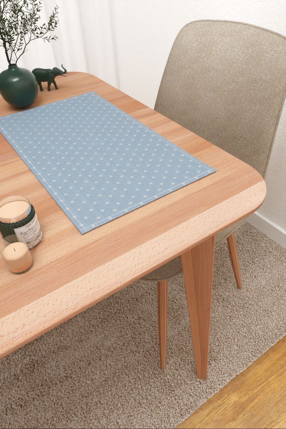 In sanftem Himmelblau bringt der Stoff eine angenehme Ruhe in den Raum. Der leise und gedeckte Ton verbreitet gleichzeitig eine behagliche Atmosphäre und schenkt dem Interieur ein freundliches und frisches Flair. Dazu tragen auch die schimmernden Punkte bei. Weitere Blau- und Grautöne passen hierzu besonders gut; helle oder rötliche Holzmöbel und Textilien in Nude sorgen für den wohnlichen Charakter.