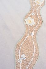Diese Oster Tischdeko von Plauener Spitze® kann als Tischdecke, Tischläufer oder kleines Deckchen umgesetzt werden. Mit einer fliessenden, wellenförmigen Umrandung ist diese Tischdeko gestaltet. Die grossen Wellen als Rahmen sorgen für eine federleichte, unbeschwerte Atmosphäre und tauchen im Inneren als Umrahmung des Fadengewirrs in farbiger Version erneut auf. Genauso zeichnet eine feine Linie in Wellenform das Innere der Deko nach und kann dabei sogar den abstrakten Gedanken eines vierblättrigen Kleeblatts hervorrufen. Entlang dieser Linie sind Osterglocken und kleine Blümchen angeordnet, die für ein frühlingshaftes, leichtes Flair und eine milde, wohnliche Atmosphäre sorgen. An der farbigen Umrandung ist übrigens auch das Logo Plauener Spitze® in derselben Farbe aufgestickt.