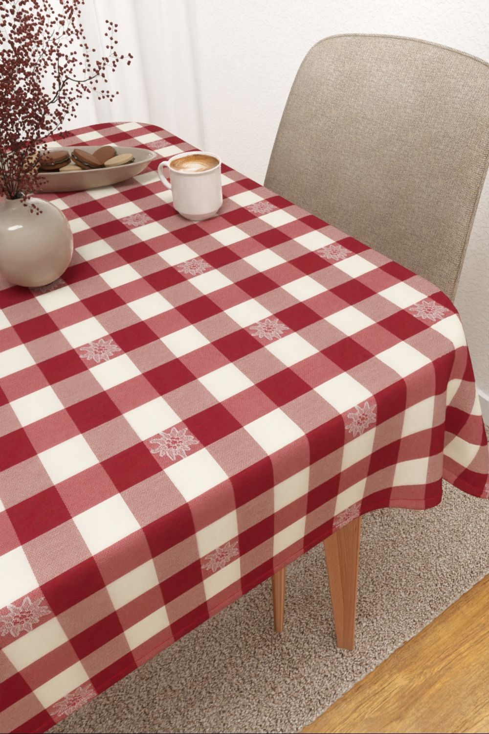 Durch das rot-weisse Karomuster erinnert dieser Dekostoff an die Tischdecken vom Italiener um die Ecke. Die glutvolle, warme Farbe wird durch das frische Weiss wunderbar aufgelockert. Naturbelassenes Holz, dunkle Grüntöne und helle Erdfarben passen hier wunderbar dazu und greifen gleichzeitig das Edelweiss-Motiv wieder auf.