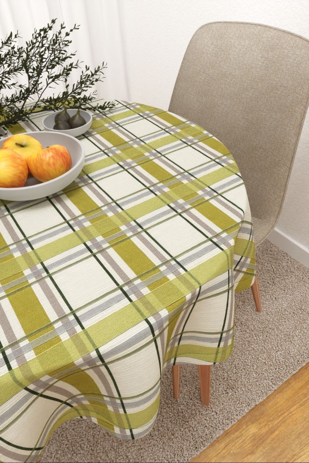 In dem karierten Muster, in welchem Limonengrün die Hauptrolle spielt, sind auch weitere, feinere Streifen in dunkleren Grüntönen, warmem Grau und einem an Taupe erinnernden Ton zu finden. Durch das Karo-Design entsteht fast von allein ein gemütliches, heimeliges Flair. Der helle Stoff und die limonengrünen Elemente sorgen für Leichtigkeit und Frische.