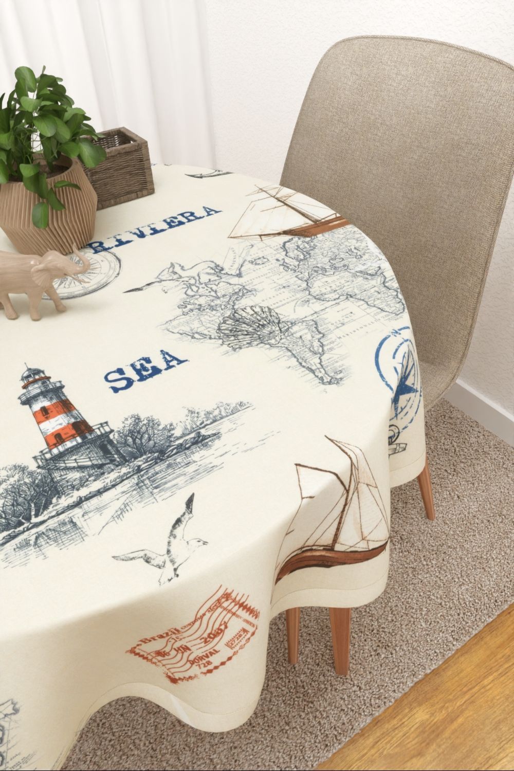 Auf dem Stoff in hellem Creme muss man die maritimen Elemente nicht lange suchen. Durch ihre Gestaltung in dunklen Blautönen, Braun und Rot wecken sie sofort die Aufmerksamkeit des Betrachters und zeigen, wo der Kurs hingehen soll. Weitere Erdtöne und viel Weiss können den Look harmonisch ergänzen.
