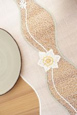 Die in dem milden, natürlichen Weisston namens Ecru gestaltete Tischdeko zeigt ein vom Frühling und von der schönen Osterzeit inspiriertes Design. Die lindgrüne Umrandung und die in pastelligem Vanillegelb und Orange gestalteten Narzissen tragen zusätzlich zu einer freundlichen, einladenden Atmosphäre bei.