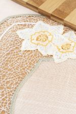 Diese Oster Tischdeko von Plauener Spitze® kann als Tischdecke, Tischläufer oder kleines Deckchen umgesetzt werden. Mit einer fliessenden, wellenförmigen Umrandung ist diese Tischdeko gestaltet. Die grossen Wellen als Rahmen sorgen für eine federleichte, unbeschwerte Atmosphäre und tauchen im Inneren als Umrahmung des Fadengewirrs in farbiger Version erneut auf. Genauso zeichnet eine feine Linie in Wellenform das Innere der Deko nach und kann dabei sogar den abstrakten Gedanken eines vierblättrigen Kleeblatts hervorrufen. Entlang dieser Linie sind Osterglocken und kleine Blümchen angeordnet, die für ein frühlingshaftes, leichtes Flair und eine milde, wohnliche Atmosphäre sorgen. An der farbigen Umrandung ist übrigens auch das Logo Plauener Spitze® in derselben Farbe aufgestickt.