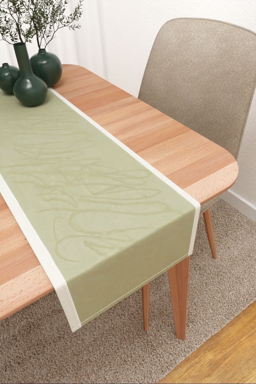 Hier wechseln sich die cremefarbenen Felder mit solchen in Olivgrün und Lindgrün ab. Die natürliche Gestaltung sorgt für ein ruhiges und entspanntes Raumgefühl. Die Arabeske-ähnlichen Ornamente unterscheiden sich vom Hintergrund durch eine streifenähnliche Struktur und eine schimmernde Optik. Hier passen rötliche Holzmöbel und softe Creme- und Beigetöne besonders gut. Das Zusammenspiel mit zarten Pastellfarben bietet sich ebenfalls an.