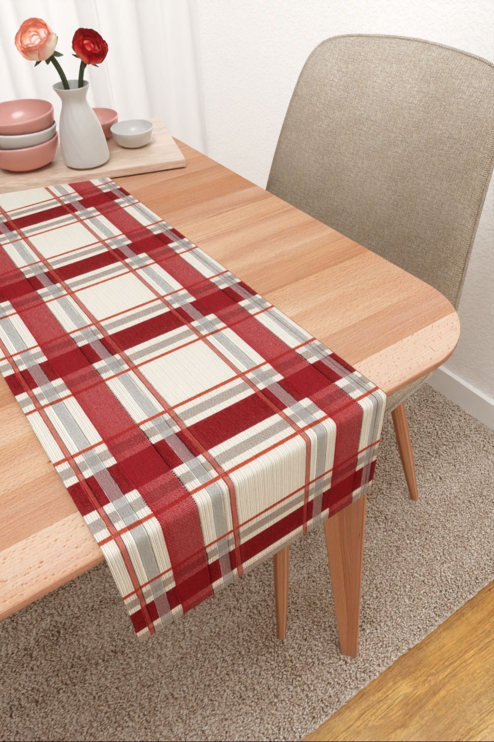 Mit diesem karierten Muster in Rot, Grau und Beige erhält der Raum ein ganz besonderes Flair. Das warme, intensive Rot sticht ausdrucksstark hervor und gewinnt sofort die Aufmerksamkeit des Betrachters. Durch die warmen und milden Töne sorgt ein Accessoire aus diesem Stoff für ein gemütliches, heimeliges Flair im Raum. Durch die Kombination mit naturbelassenem Holz, dunklem Grün und weiteren Erdfarben können Sie dies noch unterstreichen.