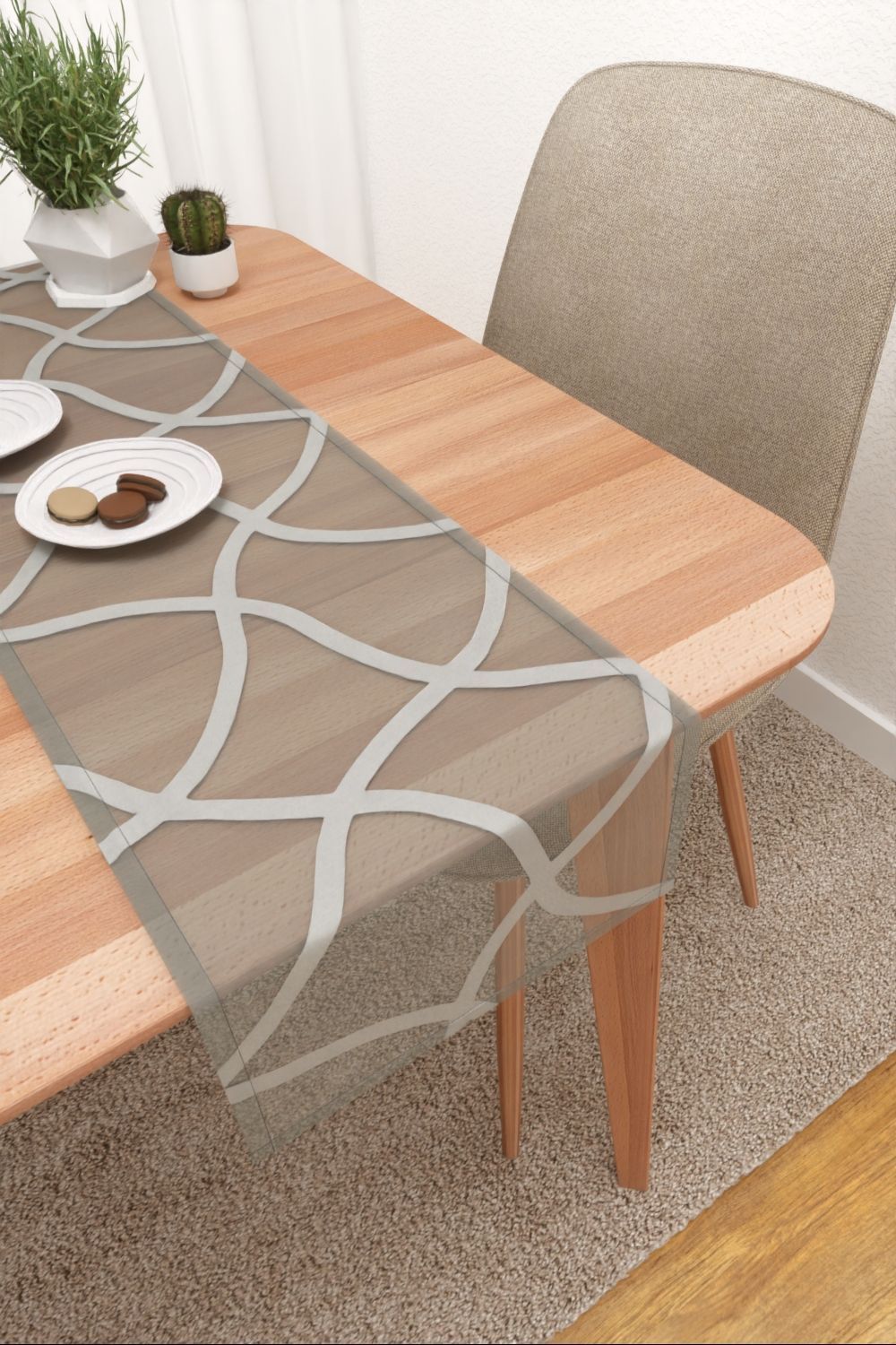 Hier ist der gesamte Stoff mit einem Muster in Ausbrenner-Optik gestaltet. Die halbtransparenten, geschwungenen Linien sind das entscheidende Designelement und nehmen die gesamte Oberfläche ein. Durch die Schnittpunkte gibt sich ein an ein geflochtenes Netz erinnerndes Design zu erkennen. Entfernt kann es auch an vom Wind bewegtes Wasser erinnern. Die unterschiedlichen Transparenzen lassen lebendige und ausdrucksstarke Effekte entstehen, die besonders bei einer Fensterdeko ihre ganze Wirkung entfalten. Nutzen Sie den Konfigurator, um beispielsweise ein Raffrollo oder einen Gardinenschal nach Mass individuell zusammenzustellen. Dabei können Sie auch Einfluss auf den oberen Abschluss, also die Aufhängung, nehmen. Als Tischdecke oder Tischläufer eingesetzt lässt dieses Modell die Oberfläche des Tisches bzw. die Optik des darunterliegenden Stoffes zum Vorschein kommen. Möchten Sie eigene kreative Ideen umsetzen, bestellen Sie die Meterware.