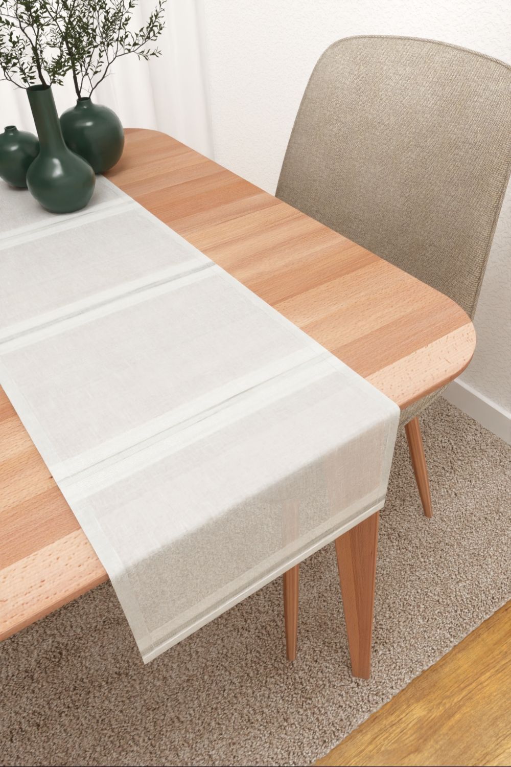 Ein modernes Streifendesign, das in weiten Abständen auf dem leinenartigen Stoff angeordnet ist, verleiht diesem Modell das gewisse Etwas. Während die Leinenstruktur eine schöne Natürlichkeit ausstrahlt, sorgen die zweifarbigen Streifen durch ihren Kontrast für einen modernen Touch. Umgeben von aufgeworfenen Webfäden in der Farbe des Stoffes hebt sich die aufgestickte, mittlere Streifengruppe durch ihre dunkle Gestaltung von diesem ab, sodass der Blick sofort darauf fällt. Das Gesamtbild wirkt ruhig und harmonisch. Dieser Stoff kann die Form eines Gardinenstores oder Raffrollos mit individueller Aufhängung annehmen. Konfigurieren Sie Schritt für Schritt Ihre Fensterdeko nach Mass, die noch dazu viel Licht in den Raum lässt. Als eleganter Tischläufer macht der durchscheinende Stoff eine mindestens genauso gute Figur. Gestalten Sie individuelle Accessoires für Ihr Zuhause oder sorgen Sie mit eigens kreierten Produkten aus der Meterware für eine noch persönlichere Note.