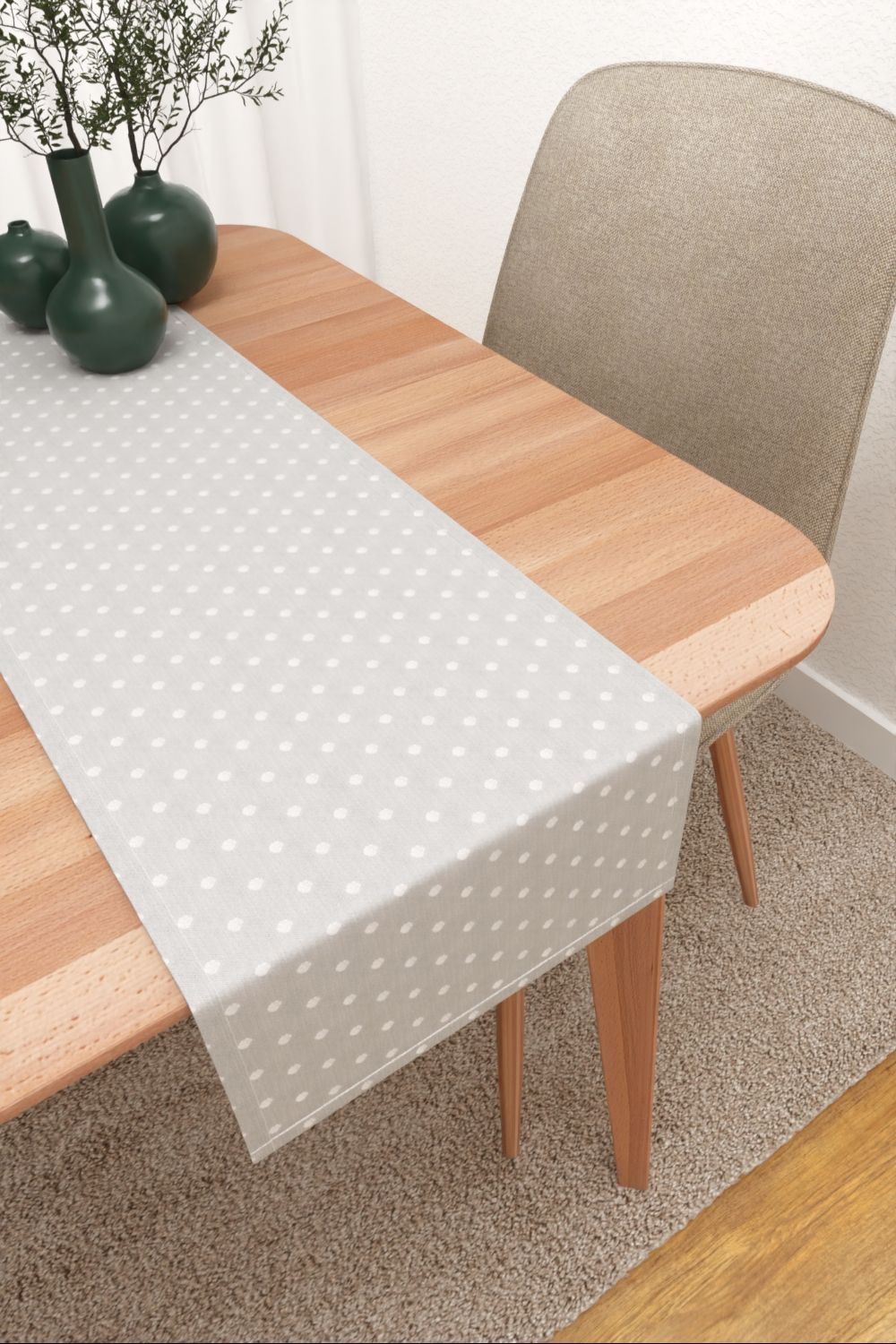 Die weissen Punkte heben sich ganz dezent von dem hellgrauen Stoff ab. Durch den leichten Schimmer verleihen sie ihm einen eleganten Look und gleichzeitig eine zurückhaltende Verspieltheit. Ein solches Wohnaccessoire lässt sich variantenreich in Szene setzen, mit tiefen Grautönen, frischem Weiss und rustikalen Möbeln ebenso wie mit zarten Pastelltönen und den Materialien Leinen, Wolle und hellem Holz.