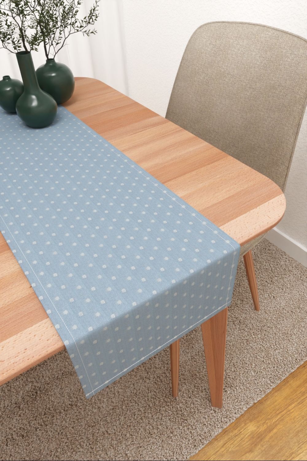 In sanftem Himmelblau bringt der Stoff eine angenehme Ruhe in den Raum. Der leise und gedeckte Ton verbreitet gleichzeitig eine behagliche Atmosphäre und schenkt dem Interieur ein freundliches und frisches Flair. Dazu tragen auch die schimmernden Punkte bei. Weitere Blau- und Grautöne passen hierzu besonders gut; helle oder rötliche Holzmöbel und Textilien in Nude sorgen für den wohnlichen Charakter.