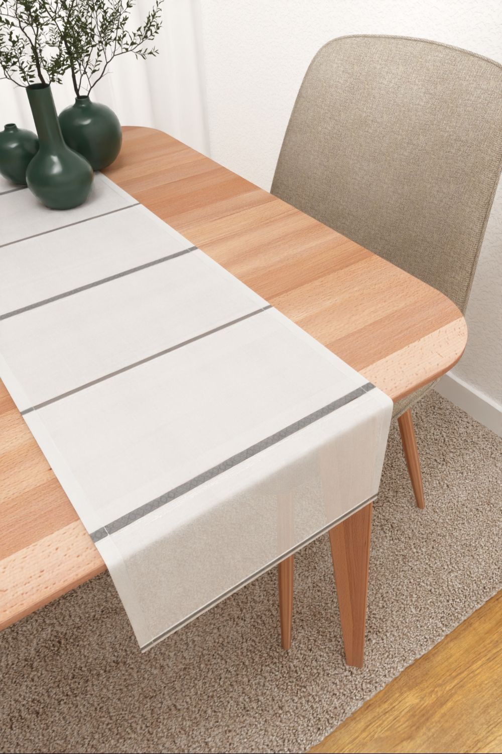 In seiner Struktur an feines Leinengewebe erinnernd trägt dieser transparente Polyesterstoff zu einem angenehmen und luftigen Ambiente bei. Er ist abwechselnd mit Streifen in unterschiedlichen Designs verziert. Eines davon zeigt ein Rautenmuster, das andere besteht aus drei feinen Linien. Da die beiden Streifen in derselben Farbe gestaltet sind, wirkt das Gesamtbild ausgesprochen harmonisch. Durch die reduzierte, kontrastreiche Optik kann sich dieses Modell in moderne Wohnumgebungen gut einfügen. Als massgefertigte Fensterdeko macht dieser am Rand mit Bleiband versehene Stoff eine besonders gute Figur. Dieses sorgt für einen schönen Fall und eine gleichmässige Optik. Für die Aufhängung und den unteren Abschluss stehen im Konfigurator mehrere Möglichkeiten zur Auswahl. Damit können Sie Ihr individuelles Accessoire gestalten. Als Meterware bietet der Stoff die grösste gestalterische Freiheit.