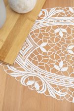 Einen schönen Mix aus modernen Mustern und floralen, von der Natur inspirierten Elementen zeigt diese runde Tischdeko von Plauener Spitze®, die wir als Tischdecke, Tischläufer, Tischband und Deckchen im Sortiment haben. Durch die luftige Maschenstruktur der transparenten, unifarbenen Deko kommt eine angenehme Leichtigkeit, durch das in sich stimmige und symmetrische Design auch eine gewisse Harmonie in den Raum. In der Umrandung sind verschiedene Blätterformen in abstrakter sowie in länglicher, geschwungener Form zu erkennen. Ein kreisförmiges Gebilde aus Linien und ineinander verwobenen Wellen trennt den äusseren vom inneren Bereich. In der Kreisform sind ausserdem grosse rautenförmige Gebilde eingefügt, die verschiedene Rahmen und Muster vereinen. Besonders viel Luftigkeit vermittelt der innere Bereich, der grobes Maschengeflecht mit abstrakten Blätterformen verbindet.
