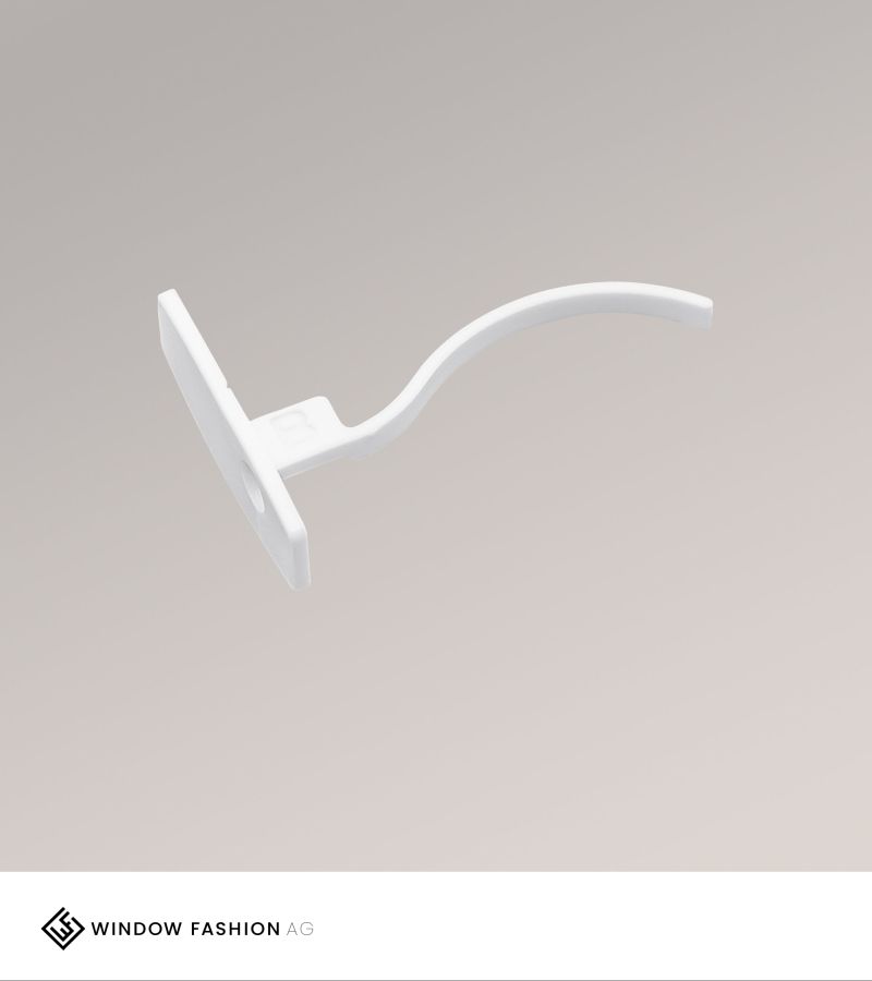 Am oberen Abschluss dient ein Keder dazu, Stoff und Schiene zusammenzufügen. Während seitliche Abdeckkappen den Stoff weiterhin festhalten, gibt es sowohl für die linke als auch für die rechte Seite der Schiene nochmals gesonderte Abschlusskappen. Diese Endkappe für die rechte Seite ist aus langlebigem und robustem Kunststoff gefertigt und wird mit den im Lieferumfang enthaltenen Schrauben in der Schiene angebracht. An den Stellen, an denen sich ein Mitnehmer am Paneelwagen befindet, ist es nötig, die Abdeckkappe an der entsprechenden Markierung in zwei Hälften zu teilen.