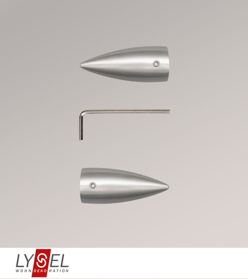 Diese ca. 5 cm langen, patronenförmigen Endstücke aus Metall eignen sich für Topaz Gardinenstangen sowie andere Gardinenstangen mit einem Durchmesser von 16 mm. Das spitz zulaufende Design bringt eine gewisse Dynamik und Lebendigkeit ins Ambiente. Mit dem beiliegenden Innensechskantschlüssel werden die Endstücke fixiert. Auf dieselbe Weise können sie wieder entfernt werden.